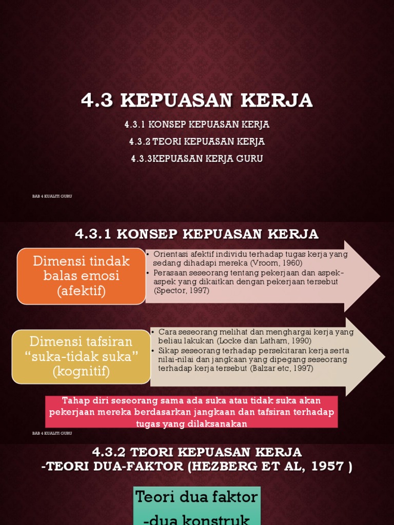 Di antara faktor yang menyumbang terhadap keberkesanan kualiti kerja guru-guru adalah dari segi kepuasan kerja. Manajemen sumber daya manusia. Kepuasan Kerja Guru Kepuasan kerja guru didefiniskan sebagai respon emosional yang dirasakan guru setelah melakukan penilian terhadap berbagai aspek dari pekerjaannya sebagai guru.