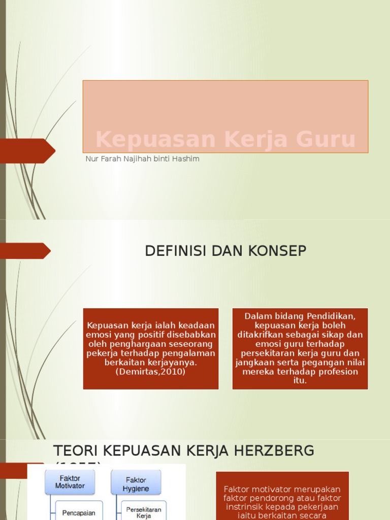 Pengaruh Budaya Organisasi Dan Kepemimpinan Kepala Sekolah Terhadap Kompetensi Dan Kinerja Guru Pada Yayasan Perguruan Sultan Agung. Peningkatan yang berlaku di dalam kepuasan kerja guru mampu memotivasikan mereka untuk meneruskan usaha bagi meningkatkan kemahiran pengajaran menjana persekitaran pembelajaran yang lebih baik dan meningkatkan pencapaian pelajar. Definisi tersebut sejalan pernyataan Robbins Robbins 2013 bahwa kepuasan kerja merujuk pada sikap umum seorang individu terhadap pekerjaannya.